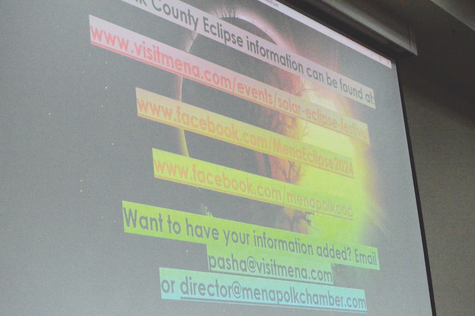 For the eclipse happening April 8, Polk County will be covered from one end to the other. Sevier County will have a few more seconds of total darkness than Polk County, but we will still have 4 minutes and 7 seconds of total darkness, weather and cloud cover permitting. The width of this total eclipse path will be 117.9 miles wide. At one point, the expected possibility of clouds was 30%-40%. That number has risen to 50% chance of cloud cover. Still, if that occurs, it doesn’t mean everyone will be incapable of viewing the eclipse. The annular eclipse that occurred Oct. 14, 2023, ended up being a bit of a bust on Rich Mountain at the last few minutes prior to the event, yet people around Lake Wilhelmina and Lake Ouachita had a great view. The less light pollution one had, the better the chance of viewing the eclipse unobstructed, but as Wade and the panel warned, be prepared for a lot of tourists.