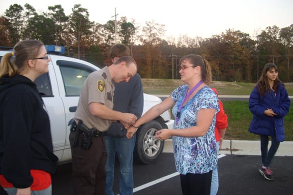 After school teacher, Mrs. Lezlie Cusher, finds out first hand what it is like to go through the handcuffing procedure.
